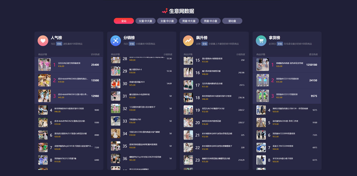 为您汇总生意网与三方电商平台童装数据,第一时间发现行业新动态,洞悉童装消费趋势,帮助您提升选款效率与竞争力,把握商机!