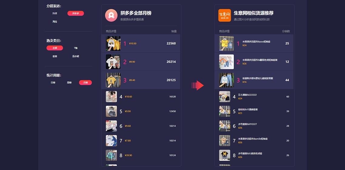 统计各大电商平台童装数据,为您发现当下热卖爆款,并推荐来自生意网的相似货源,上架稳赚!